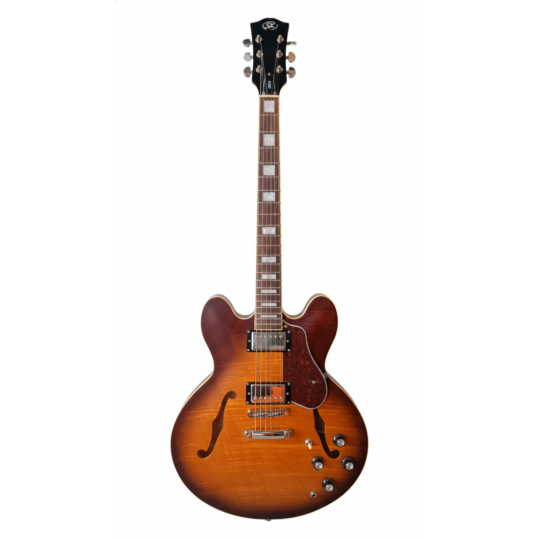 Guitarra Electrica | Legend Series | T/ 335 | RWN | Cuerpo Okoume | Flame Top | Set Neck | HH Alnico | Cenefas | Pickguard Carey | Clavijas Die Cast t/ Grover | Open Pore | C: Dark Sunburst